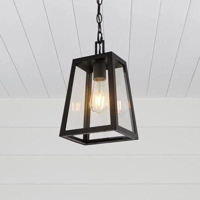 The durable metal shade has a modern black finish, with clear glass panes to protect the LED bulb. This adjustable-height pendant is suitable for ceilings up to twelve feet high; our light fixtures work with LED-compatible dimmers. Upgrade your front entry with our minimalist, modern take on an outdoor pendant light. Eco-friendly 4W LED bulb included. Takes 1 bulb and compatible with TYPE “A” 60W or CFL 13W or LED 9WBefore cleaning any lamp shade or fixture, disconnect the power source. Wipe with a soft, dry cloth. Avoid the use of chemicals and household cleaners as they may damage the finish.