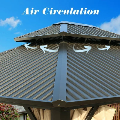 Experience the ultimate outdoor retreat with the Aoodor Hardtop Gazebo. Perfect for lawns, gardens, backyards, and pools, this spacious 10′ x 12′ canopy provides a covered and protected space for gatherings and relaxation. The powder-coated steel and nylon construction ensures durability and protection against harmful UV rays and the elements. The ventilated top design enhances air circulation, keeping you cool and providing stability even in high wind conditions. With side curtains for added privacy and light blocking, this gazebo creates a cozy and inviting atmosphere. Weighing 215.49 lb, it is a sturdy and reliable choice for outdoor enjoyment.