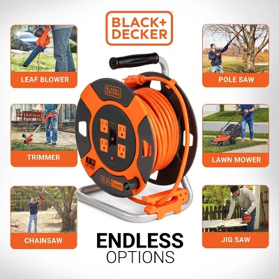 - Power Where You Need It: Make sure you have plenty of outlets while working outside with this Extension Cord Reel with 4 outlets from BLACK + DECKER! This 75 ft electric extension cord is CSA certified and has an On/Off switch and light indicator.
