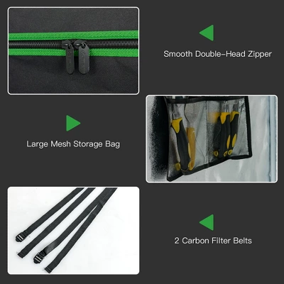 In order to take care of the plant sprout, our grow tent creates a safe growing place. Crafted by heavy-duty zinc-plated holes, this growing house ensures excellent stability and sturdiness. Plus, lined with highly reflective mylar, this grow tent will maintain the optimal temperature all-year-round. And the tightly stitched 600D canvas exterior well prevents light leakage. In this way, you can cultivate the herbs, fruits, vegetables and flowers in winter season. In addition, multiple vents are designed for filter installation and the bottom mesh window to keep insects out. The large observation window allows you to peek inside conveniently, and the inside mesh storage bag for tools placing. Humanized features help you to better operate your gardening work.
