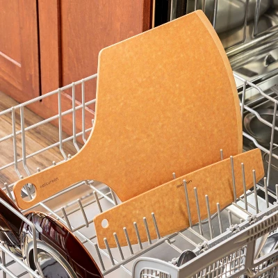 Epicurean pizza tools are made from paper composite and are made in the USA. Epicurean products have the look and feel of wood without the required wood board maintenance. Save time and effort by washing and santizing this board in the dishwasher.