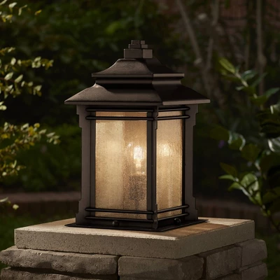 Inspired by traditional Mission Arts and Crafts styles, this outdoor pier light is a beautiful addition on top of a column or other flat surface. From the Franklin Iron Worksâ„¢ brand, this classic design consists of a lantern-shaped profile frame, with a tiered top for a lovely architectural look. A walnut bronze finish adds a handsome touch, while textured frosted cream glass panels provide a warm and welcoming glow.