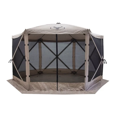 Get outdoors and stay protected from the elements with the G6 6-Sided Portable Gazebo from Gazelle Tents. With its innovative design and easy setup, this gazebo provides a spacious and comfortable shelter for all your outdoor activities. Its six-sided construction offers excellent coverage and versatility whether you’re camping, hosting a picnic, or simply relaxing in your backyard.This deluxe gazebo is the ultimate shelter, featuring 92 square feet of space and standing 86 inches tall. This portable screen room measures 12 feet by 12 feet (set up size) and provides enough space for 4 people and a table. The tight-weave mesh screens feature zippered openings to increase ventilation so you get great airflow while inside. In addition, this pop-up tent features attached wind panels with zippered openings, and the front wind panel can double as an awning. The 210 denier Oxford weave polyester shell and roof material is waterproof up to a 2000MM HH rating, making it suitable for moderate rain. Features a UV50-plus rating to ensure safety from the sun’s rays. The screened gazebo comes with durable all-terrain stakes, guy lines, an oversized duffle bag for easy storage, and a large main door that offers an effortless entry.Great for watching outdoor sports events, hosting a family get-together, and more, the G6 6-Sided Portable Gazebo Screen Tent is the ultimate in outdoor shelters!