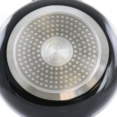 Have your kitchen essentials ready with this Gibson Home Ellsworth 3.5 Quart Aluminum Nonstick Saute Pan With Lid. With a gorgeous golden handle and elegant black and gold speckled interior, this pan is just as great to look at as it is to use. This pan is perfect for new home owners or even those looking to upgrade their cookware. Nonstick interior and ergonomic handles makes it super easy and convenient to use. Tempered glass lid allows you to safely watch your food while it’s cooking. Although dishwasher safe, it’s highly recommended to hand wash as extensive use of detergents may cause surfaces to dull.
