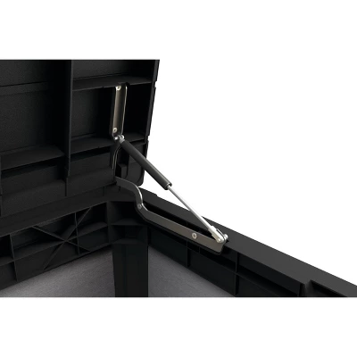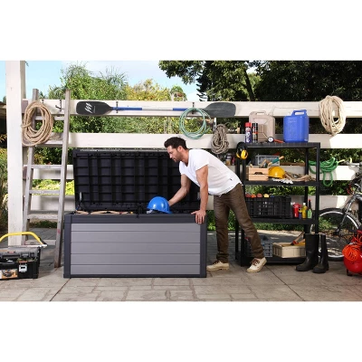 The stylish, attractive, classy, multifunctional design of the Premier 150-Gallon Deck Box by Keter is the best outdoor storage solution. It not only helps organize your garden tools, sporting equipment, outdoor furniture cushions, or other pool accessories, it can also serve as a beautiful bench that enhances your outdoor living space and blends flawlessly with your décor. This Deck Box is constructed with ultra-durable resin for weather resistance to all elements. This box won’t rot, peel, or rust like real wood or metal. Features & Benefits Dimensions: 59. 7 in. L x 28. 5 in. W x 27. 55 in. H A generously sized 150-gallon interior that provides plenty of space for garden accessories, pillows, or other items Easy to keep in great shape, thanks to the weather-resistant and UV protected resin material Will never rot, rust, fade or dent Resin double wall construction for extra durability Very easy straight-forward assembly Satisfactory 2-years Convenient piston system that opens and closes smoothly and will not slam shut Can also be used as a bench for extra seating in a pinch Lockable to keep your items protected day and night Beautiful and classy gray color, dual tone wood-like panel appearance that will match any exterior color schemes Easy to clean and requires no maintenance.