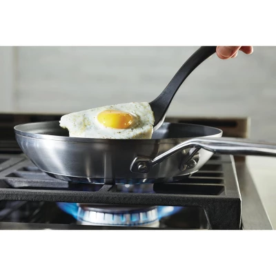 Experiment with and discover new flavors and techniques when cooking with the KitchenAid 3-Ply Base Stainless Steel Nonstick Frying Pan, designed with an extra thick layer of heat-conducting aluminum to eliminate hot spots by distributing heat evenly from edge to edge. Heavy-gauge stainless steel pan features a heavy bottom induction base for lasting durability and features a dual-riveted handle for strength and comfort when moving around the kitchen. Fry pan is finished with premium triple-layer nonstick that is strong enough to stand up to daily wear and tear. Curious cooks can investigate a wider range of recipes in the oven, where cookware is safe to 500°F.
