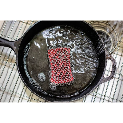 The Lodge Chainmail Silicone Scrubbing Pad is made of stainless steel chainmail rings to create a textured surface that is ideal for heavy-duty cleaning, is dishwasher safe, requires minimal storage space, and will lasts a lifetime. The silicone inner pad adds rigidity and keeps your hands out of the mess. Easy to clean and is dishwasher safe.
