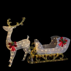 Bring some holiday magic to your outdoor space with the elegant pre-lit LED outdoor holiday decoration. Standing tall with its beautiful champagne-colored finish, this stunning decoration features energy-efficient LED lights that will shimmer and sparkle throughout the holiday season. Whether placed on your lawn, porch, or garden, this magnificent deer will bring a touch of holiday magic to your outdoor space and make your home the envy of the neighborhood. Product Features:Pre-lit with 105 warm white lightsBulb size: wide angleBulb type: LED16′ clear lead cordAdditional Product Features:LED lights use 90% less energy Lights stay cool to the touch Some assembly requiredGround stakes and cable ties includedLights are UL approved and certified for indoor or outdoor useAdapter: 4.5V/3.6WDimensions: 48″H x 27″W x 20.5″DMaterial(s): sisal/metal/glass