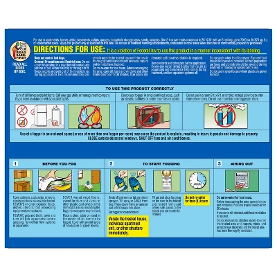DIRECTIONS FOR USE: It is a violation of Federal law to use this product in a manner inconsistent with its labeling. Does not control bed bugs. General Precautions and Restrictions: Do not apply this product in a way that will contact any person or pet, either directly or through drift. Keep people and pets out of the treated area during application. Exit area immediately and remain outside the treated area until the area is thoroughly ventilated and until aerosols, vapors and/or mists have dispersed. Do not re-enter for four hours. Before reoccupying the area, open all doors and windows and allow treated area to air for 30 minutes. If an odor is still detected additional ventilation is required. Remove birds and other pets before application. Cover any water inhabited by fish (such as aquariums and ornamental fish ponds) during treatment, and turn aquarium systems off. Do not apply when food is present. Exposed food should be covered or removed. All food preparation surfaces and utensils should be covered during treatment or thoroughly washed before use. Do not use in greenhouses where plants are grown for food. TO USE THIS PRODUCT CORRECTLY: Turn off all flames and pilot lights. Call your gas utility or management company if you need assistance with your pilot lights. Do not use fogger in small confined areas, such as closets, cabinets or under counters or tables. Do not use in a room 5 ft. x 5 ft. or smaller, instead allow fog to enter from other rooms. Do not use more than one fogger per room. Use of a fogger in an enclosed space (or use of more than one fogger per room) may cause the product to explode, resulting in injury to people and damage to property. CLOSE outside doors and windows. SHUT OFF fans and air conditioners. 1. BEFORE YOU FOG: Open cabinets, cupboards, drawers, closets and doors in areas to be treated. REMOVE or cover exposed foods, dishes, utensils, food processing equipment and surfaces. REMOVE pets and birds, cover and turn off fish aquariums before spraying. Turn off air flow systems in aquariums. COVER waxed wood floors, waxed furniture and stereo or other plastic dust covers in the immediate area surrounding the fogger (newspapers may be used). Place a chair, table or stand in the center of the room to be fogged. Cover with several layers of newspaper or paper towels. 2. TO START FOGGING: Break off and remove tab on side of sprayer. Tilt sprayer AWAY from face. Press down firmly on sprayer pad until it snaps into place. Set fogger on covered stand. Fill out and place hang-tag on the door to the treated area to alert family and others with access to the treated area not to enter for 4 hours. Vacate the treated house, individual apartment unit, or other structure immediately. Do not re-enter for four (4) hours 3. AIRING OUT: Do not re-enter for four hours. Before reoccupying the area, open all doors and windows and allow treated area to air for 30 minutes. If an odor is still detected, additional ventilation is required. Do not allow adults, children or pets to enter the treated area until vapors, mists, and aerosols have dispersed, and the treated area has been thoroughly ventilated.