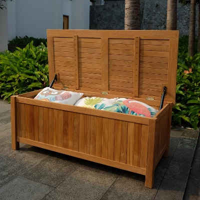 Durably constructed of high-quality teak wood, this weather-resistant Sherwood teak outdoor storage from Cambridge Casual makes a statement for your outdoor space while providing a smart storage solution for extra outdoor essentials. This wooden outdoor chest can be left outside to weather to a pleasant gray or if desired, teak oil can be applied to keep its original golden brown color. Comes with soft closure hydraulic hinges on lid. This deck boxes also serves as a side table when the lid is closed, a great multifunctional backyard piece.