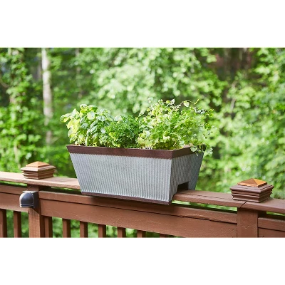 Start your herbs and flowers off right this season with the Southern Patio 24 Inch Westlake Deck Rail Garden Planter.This bundle comes with 2 sets of garden planters to meet all your needs. Whether you live in an apartment or simply want to add some greenery to your porch, this rail planter can optimize and beautify your outdoor space. The portable resin planter is a perfect addition to your deck or porch, providing a wide and deep space to grow fresh rosemary, plant tulip bulbs, or start your vegetable seedlings off for later transplanting. Made from durable resin, the accent planter box is sure to last for years to come. A pleated texture with a galvanized finish lends an old-fashioned, rustic appeal to the frame. The frame fits standard railings and can also stand on its own for use on the ground or even indoors.Give your plants a happy home with the Southern Patio 24 Inch Westlake Deck Rail Garden Planter.