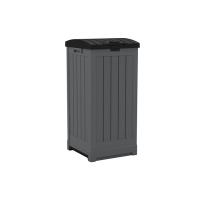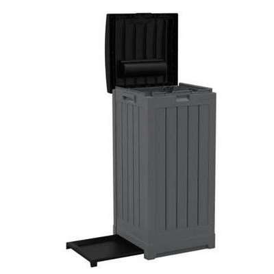 This Suncast® 36-39 Gallon Trash Hideaway® has a modern stylish design that looks great on any patio or deck and will help keep your yard clean all year long. This unit uses standard 36-39 gallon trash bags and features a trash bag roll holder, double latching lid and pullout tray for easy cleaning. Durable all-weather resin construction with comfort grip handles is easy to clean and maintain.