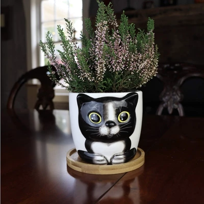 - Cat planters with bamboo saucer, hand-painted & hole for drainage.